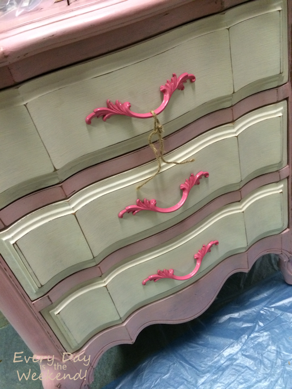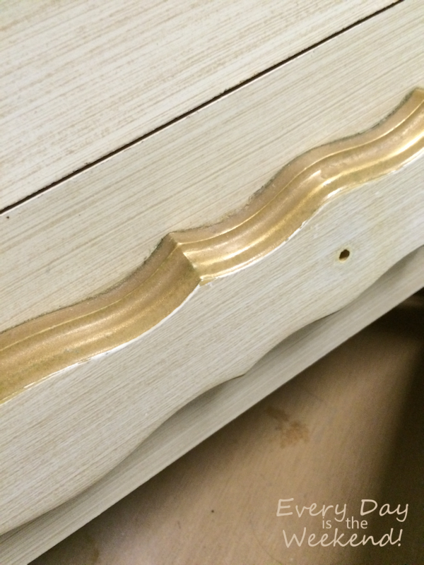 The gold and white piece is a double dresser and part of a French Provincial suite that I got when I was 13 yrs old. It’s the only piece I have left. (I’d already started painting the dresser before I thought about taking photos, so that is just a shot of the drawer.) I bought the pink and cream night stand to go along with it from a vintage market … always with the idea of repainting them to match. The furniture pieces are not perfect matches, but work great together now that they’re repainted.
